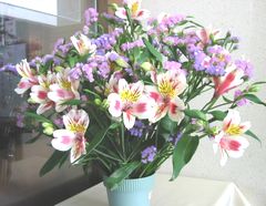 商品情報 フラワーアレンジ 2004年2月19日 by れいこ いつもお店で売っているむかわ町からの直接仕入れの花、アルストロメリアとスターチスの組み合わせでお店に飾ってみました。出来栄えは・・・(^^; 花に接し始めてまだ一年にならない私、アレンジするのもあっちへ挿しこっちへ挿し、ここは長すぎるかなと切ると短く切りすぎたりで、なかなか上出来きと思えるようになるにはかなり掛かりそうです。。。 お客様から 「お花飾ったのね、お店の中が明るくなるわね~」と言われてまんざらでもないかな・・・とちょこっと安心しましたが、いかがでしょうか。 お花