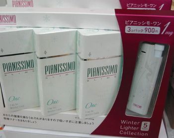 レジ周りには、いろいろな商品が並んでいます。 タバコの2コ入りライター付きもそのときどきでいろいろ変わって~ この冬だけのライターコレクション ピアニッシモ・スリム・ワン 3コパックにライターがサービ...