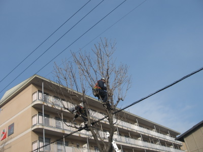 青空ですけれど体感温度が低くかった一日でした。 見あげると、木の上で剪定をされている方が! 暖冬とはいえ2月の寒さの中でのお仕事、 ご苦労様です~~~