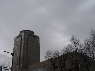 2月だというのに、今日は朝から雨模様。 写真の建物は16階建てのグランドホテルニュー王子。 そして屋上にある丸い所は緊急時用のヘリポート。 撮影 PM2:30