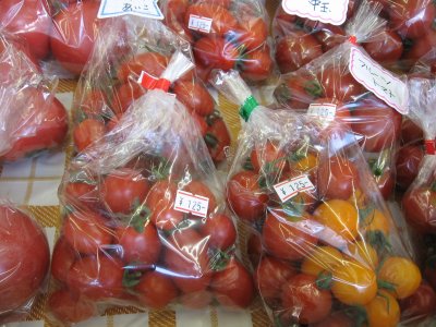 むかわ町の野菜コーナー、トマトがいろいろ。 一番大きいのが桃太郎、次の大きさのが、中玉。 そして3番目が、フルーツトマト。 ちっちゃなミニトマトは黄色のまじっているのとちょっと長めのが2種類。 このち...
